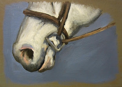 I wasn't at all sure what to paint today- Her Nuggetness is in a mood, probably because it's been raining something fierce all day, and of course that always throws everything off. But.... Her Nuggetness suggested painting a horse, and I think that was a wonderful idea! I've never tried to focus on that funny little whorl that happens between their eyes before, but it was a lot of fun to paint.